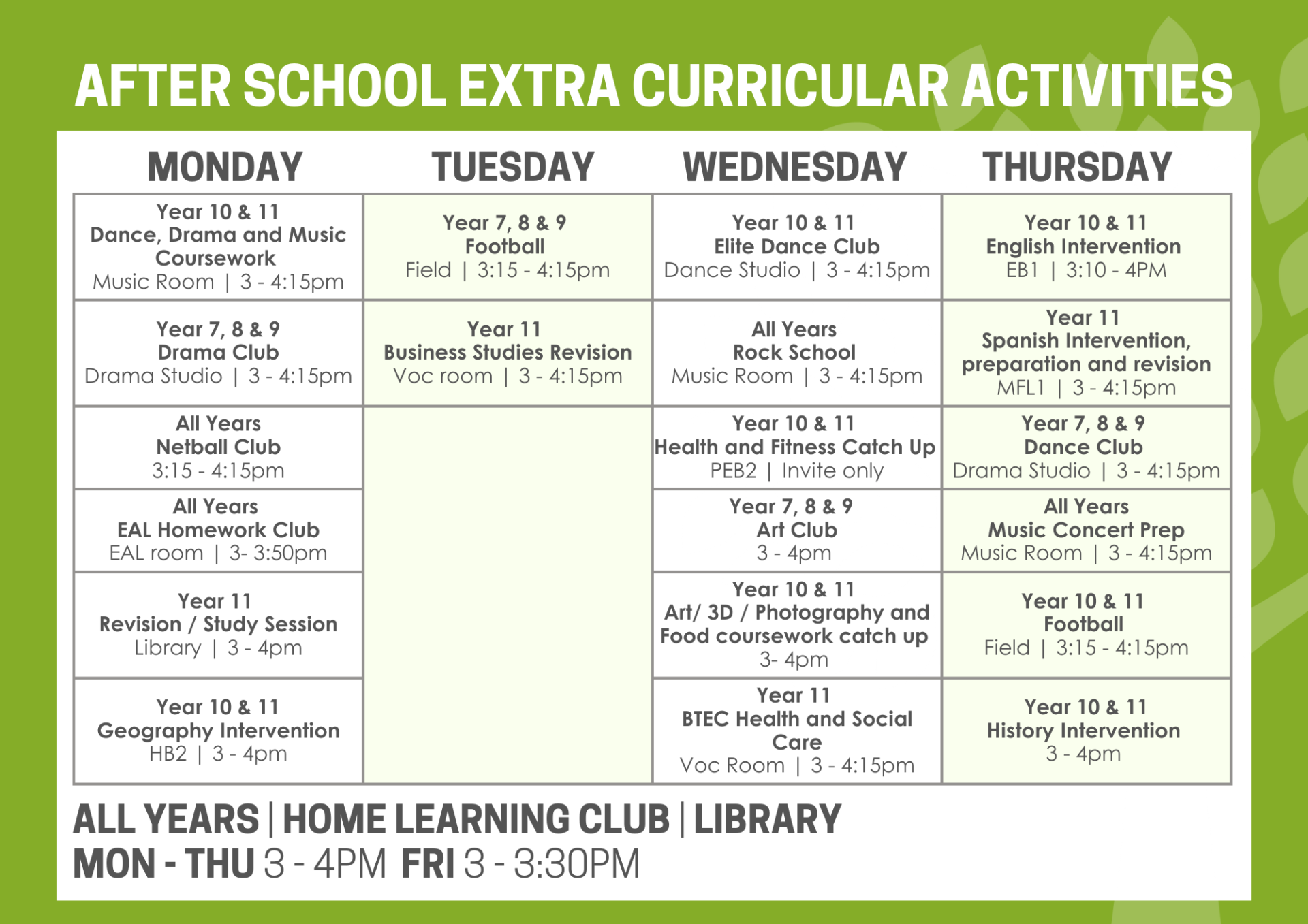 Below is an image of all of the extra curricular clubs offered at the Academy. If you want more information please see your form tutor.